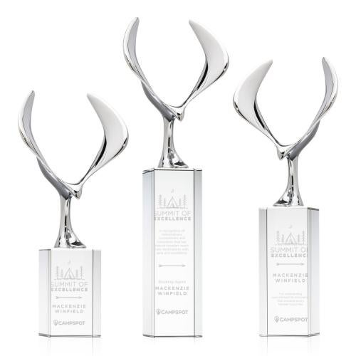 The Maverick Eagle Award showcases a soaring chrome eagle, a bold symbol of vision, freedom, and achievement. Its dynamic wingspan is elevated by a choice of elegant Optic Crystal bases, available in various shapes and finishes to suit any recognition style. This striking award makes a powerful statement, celebrating excellence with both strength and sophistication.