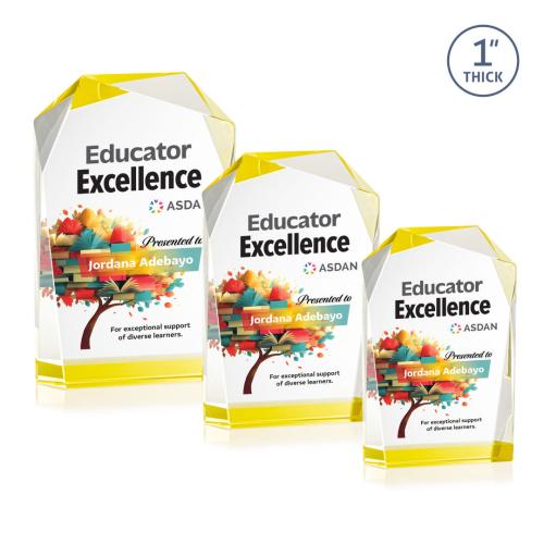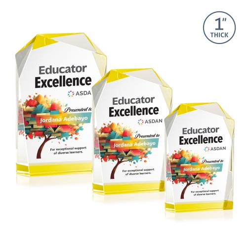 The elegant freestanding Donvale VividPrint award features a modern geometric design with beveled edges and a vibrant gold accent at the base that reflects throughout the top bevels. Crafted from optical crystal, its asymmetrical angles catch the light beautifully, creating a striking visual effect. Available in three sizes, it's perfect for recognizing excellence with a sophisticated and contemporary touch. Bring your artwork to life with full-color VividPrint!