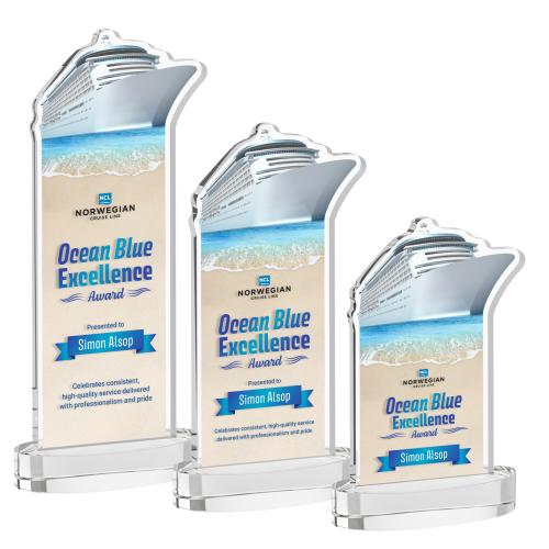 The Voyager VividPrint Award is a stunning optical crystal piece featuring a beautifully imprinted ship at the top, with the upper portion precision cut in the shape of a ship to create a striking dimensional silhouette. Mounted on a sleek oval Alberton base, this award offers a modern architectural look while providing ample space for custom engraving of names, logos, and award titles. Ideal for maritime, cruise line, transportation, travel, and corporate leadership awards such as "Captain's Award" or "Top Navigator," it symbolizes strength, guidance, and excellence. Make your logo POP! with full-color VividPrint!