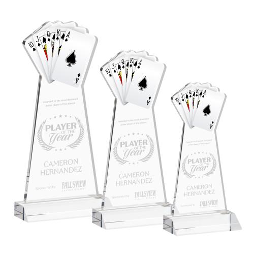 The Poker Award is crafted from premium Starfire Crystal and features a detailed deck-of-cards cutout at the top, complete with a vibrant imprinted card design for striking visual impact. Mounted on a precision front mitered base, the clear crystal construction delivers brilliant clarity and a refined, contemporary presence. Perfect for tournaments, casino-themed events, and player recognition, this award is a winning tribute to standout performance. Second Position Etch & Colorfill Optional.