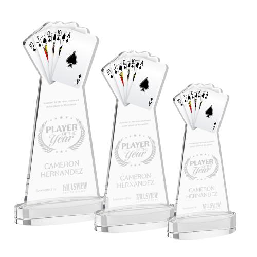 The Poker Award is crafted from premium Starfire Crystal and features a detailed deck-of-cards cutout at the top, complete with a vibrant imprinted card design for striking visual impact. Mounted on an oval Alberton base, the clear crystal construction delivers brilliant clarity and a refined, contemporary presence. Perfect for tournaments, casino-themed events, and player recognition, this award is a winning tribute to standout performance. Second Position Etch & Colorfill Optional.