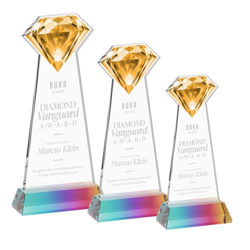 Recognize exceptional achievement with the Gemstone Award, crafted from brilliant Starfire crystal and topped with a striking gemstone-shaped cutout. The design features a vibrant printed gemstone image at the top in your choice of 10 colors and is mounted on a sleek, side-tapered base for an elegant, contemporary presentation. Second position etch and colorfill optional, and the gemstone accent is available in nine different colors to suit your brand or event theme.