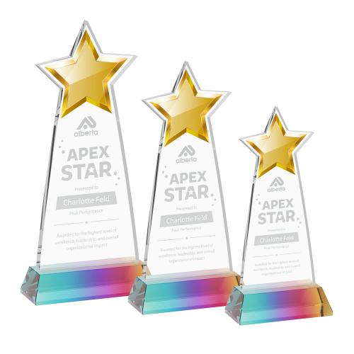 The Starlite Award is a sleek starfire crystal piece featuring a striking star cutout at the top, complete with an imprinted star in your choice of 8 colors for added brilliance and distinction. Its contemporary design offers generous engraving space for personalized names, logos, and award titles, making each piece uniquely meaningful. Ideal for corporate recognition, sales achievements, employee excellence, and "Star Performer" or "Apex" awards, this elegant design celebrates those who truly shine. Mounted on a Hartford base. Second Position Etch & Colorfill Optional.
