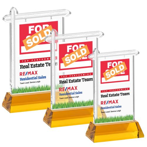 Celebrate outstanding sales success with this distinctive Starfire crystal Real Estate VividPrint Award, designed in the shape of a classic property sign. Crafted from brilliant, ultra-clear crystal and mounted on a sleek side-tapered Hartford base, the design features a hanging SOLD sign panel and vibrant grass detail. A striking and memorable recognition piece for top-performing agents, brokers, and teams.