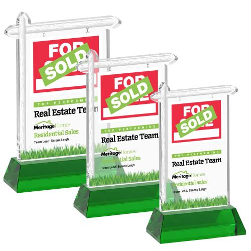 Celebrate outstanding sales success with this distinctive Starfire crystal Real Estate VividPrint Award, designed in the shape of a classic property sign. Crafted from brilliant, ultra-clear crystal and mounted on a sleek side-tapered Hartford base, the design features a hanging SOLD sign panel and vibrant grass detail. A striking and memorable recognition piece for top-performing agents, brokers, and teams.