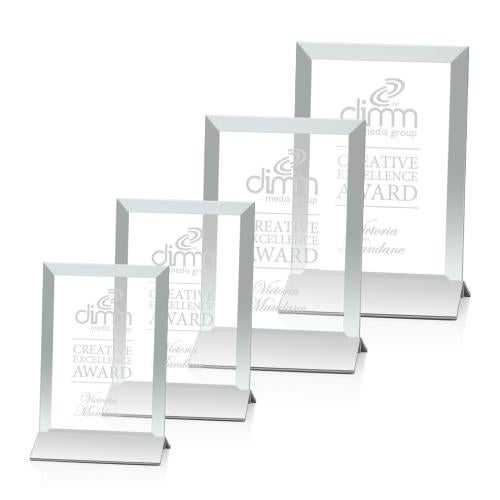 An elegant pane of starfire crystal is beveled, then mounted in a silver powder coated aluminum base to construct this understated award of unparalleled beauty.