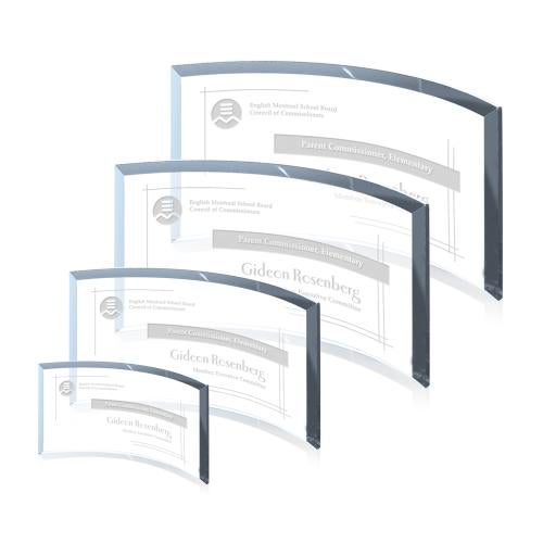 The 3.5" high, 6" wide Crescent is a freestanding, curved and beveled rectangle in 0.375" Starfire glass. Also available in 4"X8", 5"X9" and 6"X11" sizes and in grey, jade and teal glass.