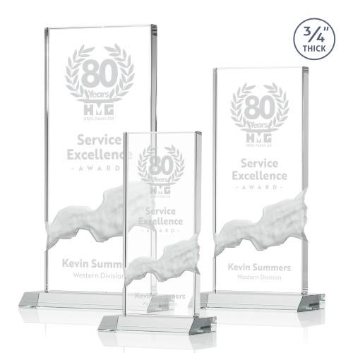 The striking Starfire Crystal Poole Award features a .75" thick Vertical Upright with a deep carved cascading waterfall effect sculpted right into the award. Mounted on a clear polished front mitered base, these unique awards add a contemporary twist to traditional corporate recognition. 2nd Position Etch Optional.