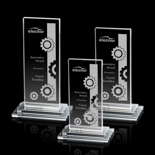 The tall Santorini award is a large panel of luminescent starfire glass that shimmers from its top to its thick stacked double base.