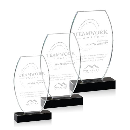 Clear Optical Crystal is given broadly arched sides to create this amazing statement of simplicity and grace, mounted to a thick Black Optical Crystal base.