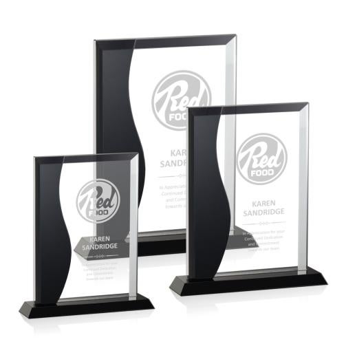 Black optical crystal is cut into this graceful organic shape and combined with a clear optical crystal rectangle to give the Glamorgan Award the dramatic tension of a gallery-quality sculpture.