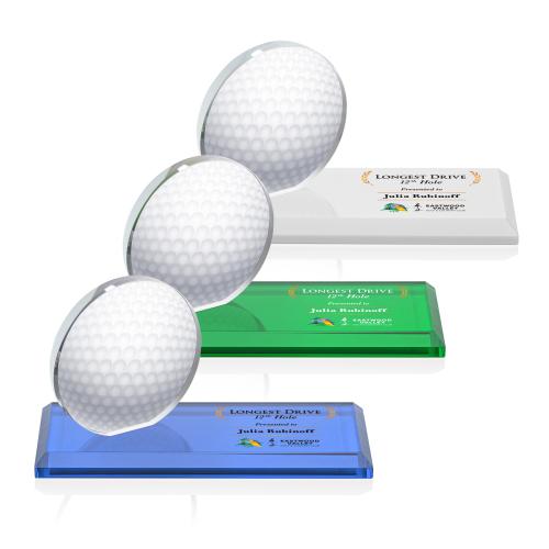 Golf strong, go long. The Golf Northam VividPrint Award features a 3.5" Starfire Crystal circle with a beautiful image of a golf ball, mounted on your choice of a colored crystal base or a triple-stepped piano-finished rosewood or bamboo base. **Second-position baseball imprint included.**