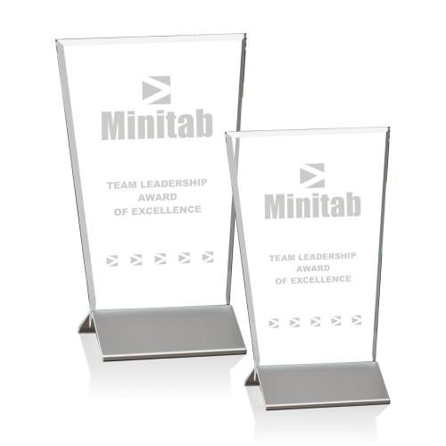 The Kavan is one of a family of four narrow-beveled, .25" thick starfire glass uprights slotted into pleated aluminum bases, a light weight combination with a large etching area. In the 6" high Kavan, the upright is gently flared and straight-topped. Also available in an 8" version.