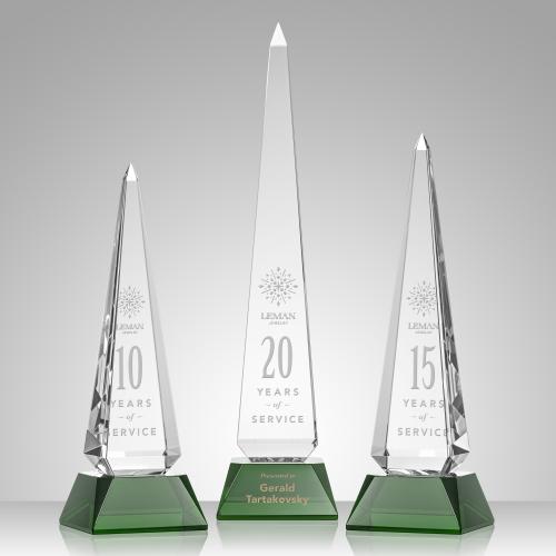 The Helmsley Obelisk - Green is a symbol of excellence and success. This impeccable piece, with its slender and sleek profile, gracefully ascends to a fine point, inviting admiration from every angle. The lustrous clarity of the crystal amplifies its stature, while the deep etch decoration method allows for precision engraving, making it a personal tribute to outstanding achievements. Ideal for engraving milestones, names, or logos, it stands as a testament to dedication and hard work. Whether for corporate recognition or a personal milestone, this obelisk is a distinguished choice that will be cherished for years to come.