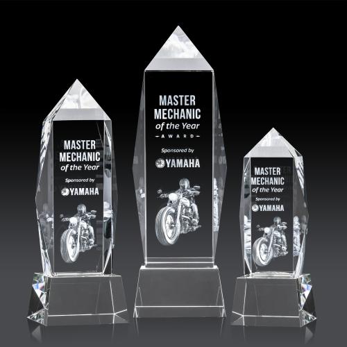 Elevate your accolades with the refined elegance of the Bloomington on Base 3D - Clear. This prism of purity catches the light, illuminating the meticulous 3D etching within. A statement of sophistication, this obelisk award embodies prestige, standing tall as a beacon of achievement. Ideal for personalization, its crystal canvas awaits your custom message, logo, or image to transform it into a one-of-a-kind tribute. The award's graceful tapered base not only provides stability but also complements its sleek verticality, making it a centerpiece that commands attention in every room it graces.