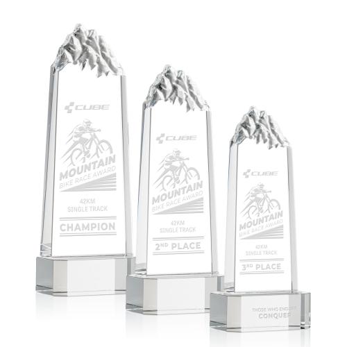 The Himalayas Tower Award is for the individual who exceeds limits and accepts every challenge to get to the top! This freestanding thick Optical Crystal Tower features chiseled mountain peaks at the top of the award. Complete with a sapphire, emerald, ebony, or clear thick Optical Crystal base. Second position etch and colorfill optional.