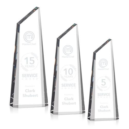 Stunning trapezoidal tower award is anchored with a thick optical crystal bottom that tapers to a peak. Experience a new glimmer of radiant light at each angle of this exquisite crystal obelisk award.