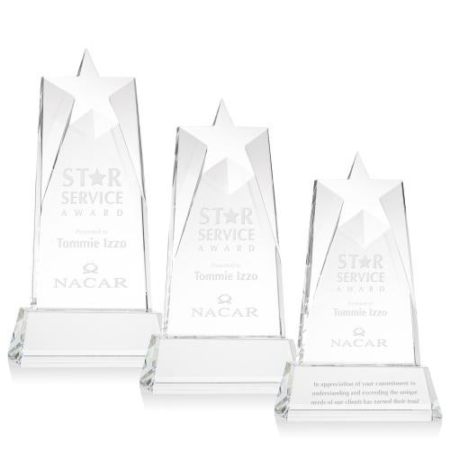 The Millington Star on Base - Clear epitomizes recognition with its pure, unadorned lines and a flawless star silhouette poised atop a sturdy pedestal. Its transparency reflects not just the ambient light but also the radiance of excellence embodied by its recipient. Ideal for personalization, it offers ample space to engrave heartfelt messages, logos, or names, making it not only a symbol of appreciation but also a bespoke memento. Whether for corporate commendations or personal milestones, this award resonates with the message that the awardee's contributions shine brightly, much like a star in the firmament.