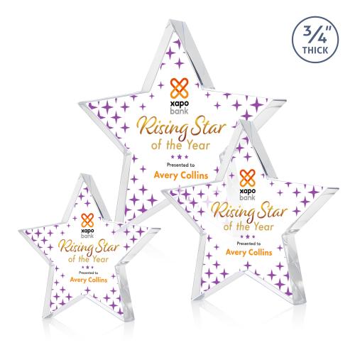 The Esna Star VividPrint Award is a freestanding, .75â³-thick Starfire crystal award featuring a bold star silhouette with precision-cut edges that reflect light with striking brilliance. Its substantial crystal design conveys achievement and forward momentum, making it ideal for recognizing standout performance and rising talent. Available with clear, gold, emerald, ruby, or sapphire accents, this award offers a polished way to celebrate excellence with lasting impact.