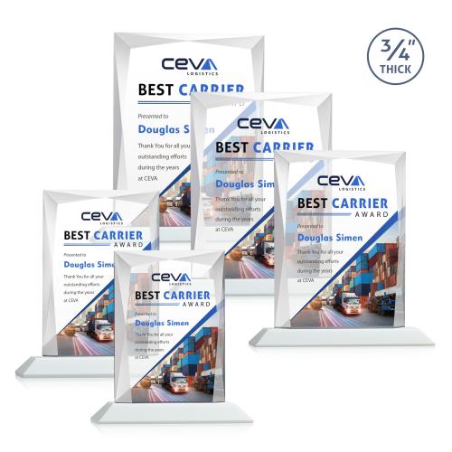A staple of the recognition industry, the Messina is a striking award in thick 3/4" Starfire Crystal mounted on clear or colored base. Featuring brilliant interchanging bevels that create a beautiful frame of refracting light for your special achievement. Let your message POP with full color VividPrint!