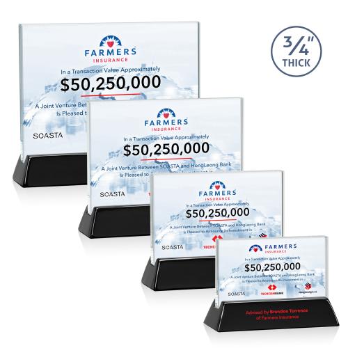 Elegant Rectangular Starfire horizontal award on a high-gloss piano black finish base. Available in 4 sizes. Let your message POP with full color VividPrint.