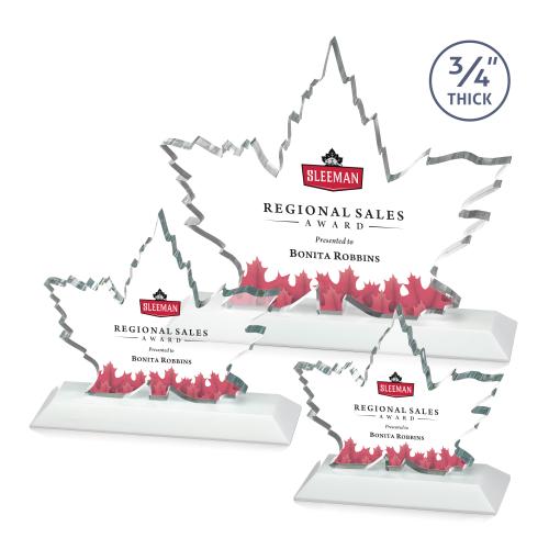 Stunning Starfire Crystal formed into a beautiful maple leaf with acid polished edges and mounted on top of a mitered White crystal base. A great symbol of Strength, Perseverance and Canadian Pride. With our added full color VividPrint, your Maple Leaf award will soar to the highest peaks of recognition.