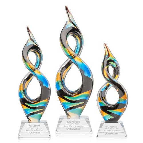 For a bold departure from the predictable, discover the captivating elegance of our Cosenzo Art Glass Award. Its flowing infinity-inspired form is a mesmerizing interplay of movement and balance, while vibrant ribbons of blue, teal, amber, and black swirl together in a dynamic dance of color. Each piece is individually hand-shaped and colored by skilled artisans, ensuring that no two are exactly alike. The solid optical crystal base offers a refined, etchable surface for logos, names, or messages, making it as personal as it is striking. Ideal as a decorative centerpiece or as an unforgettable recognition piece, the Cosenzo transforms any presentation into a visual celebration.