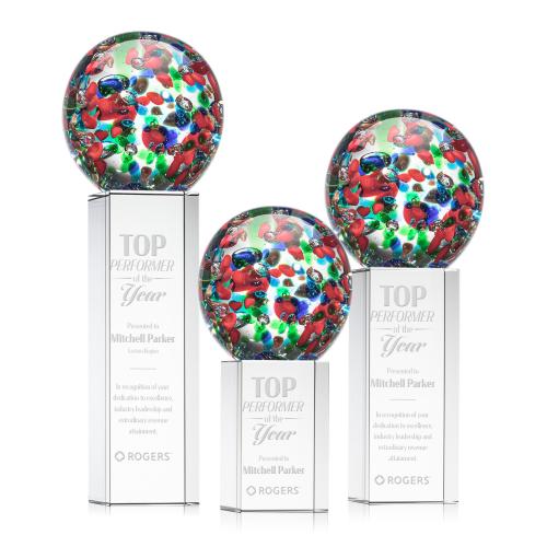 The Fantasia Award is a spectacular hand-blown work of art. A perfect sphere of abstract vibrant colors to dazzle the eye. Mounted on our tall Optical Dakota base. Each piece is individually handcrafted and no two pieces are identical.