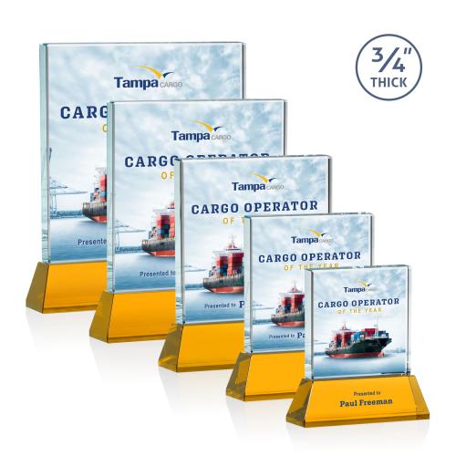 The Terra Full Color Amber on Newhaven Crystal Award symbolizes prestige and recognition, making it an ideal emblem of appreciation for standout performers and milestones. While each award starts as a blank canvas awaiting your custom imprint, the Vividprint™ decoration method brings your message to life in stunning, full-color detail. The robust 0.75-inch thickness and the tapering Starfire base project durability and elegance, emphasizing the weight of the recipient's accomplishments. With eight base color options, personalization becomes part of the award's artistry, ensuring that each piece is as unique as the achievements it celebrates.