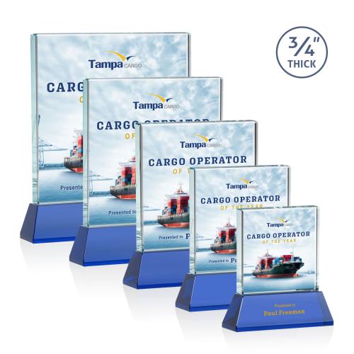 Celebrate success with the Terra Full Color Blue on Newhaven Crystal Award, a prestigious mark of distinction for any recipient. This award's elegant design consists of a thick 0.75-inch Starfire Crystal pane, poised gracefully atop a sleek, tapered base available in a spectrum of eight vibrant colors to match your branding. Customize the expansive surface with our state-of-the-art Vividprint™ technique, for a full-color representation of your logo or a heartfelt message. Perfect for corporate galas or team milestones, this award will become a treasured acknowledgment of dedication and outstanding performance.