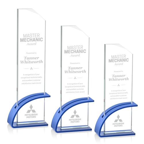 The spectacular Barton Award features a tall Starfire Crystal pane with a clipped and beveled top and held upright with a slotted brushed aluminum blue base. A great choice for employee recognition or sales achievement awards.