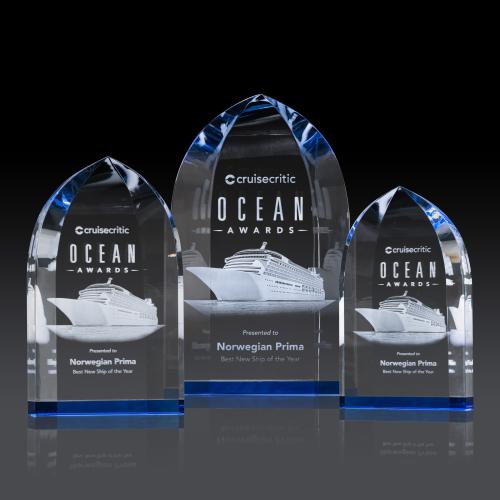 The freestanding Strobel Optical 3D Subsurface award combines optical blue accents that reflect through the arched peak with deeply beveled sides dramatically tapering at the apex. A sparkling optical crystal award of weight and substance.