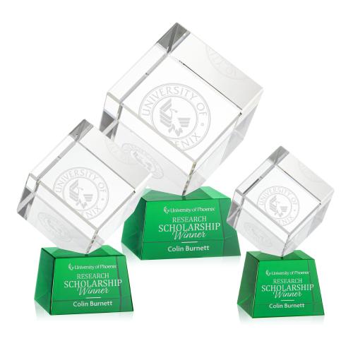 A perfectly polished cube made from the purest Optical Crystal. Features a subtle single beveled edge all around. Let this recognition piece shine as an award, paperweight or momento for your desk or shelf. Complete with your choice of Clear, Ebony, Sapphire, or Emerald tapered Optical Crystal base.