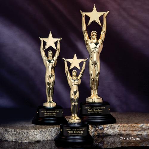 Embodying the pinnacle of success, the Gold Achievement Star Wood Award serves as a prestigious symbol of excellence and accomplishment. This exquisite piece, standing proudly with figures elevating a shining star, captures the essence of aspiration and triumph in its dynamic pose. The harmonious blend of lustrous gold-plated metal and the deep, rich tones of the ebony wood base exemplifies a classic elegance, making it ideal for corporate recognition, academic honors, or any distinguished achievements. Each award is masterfully prepared for personalization, offering a bespoke tribute to the recipient's noteworthy contributions and stellar performance.