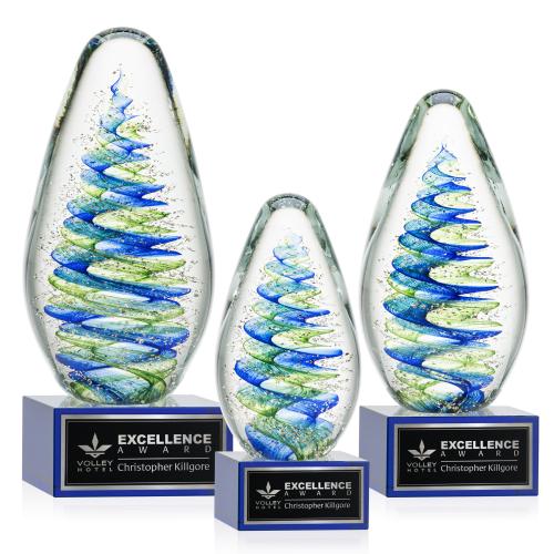 Elevate your recognition with our breathtaking blue and green swirl design art glass award, a stunning masterpiece hand-blown to perfection. Accompanied by your choice of base for personalized engraving with a logo or name, each piece embodies individuality and craftsmanship. Individually hand-crafted, no two awards are alike, ensuring a unique and captivating symbol of achievement for any recipient.