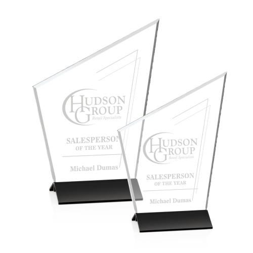 A tapered slant topped starfire crystal shape is beveled to reflect light and then mounted to a satin finished black aluminum base to create this stunning, artistic award.