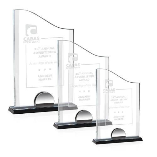The unique Starfire Manola award features a curved top, bevelled sides and a chrome finished accent mounted on a black crystal base.