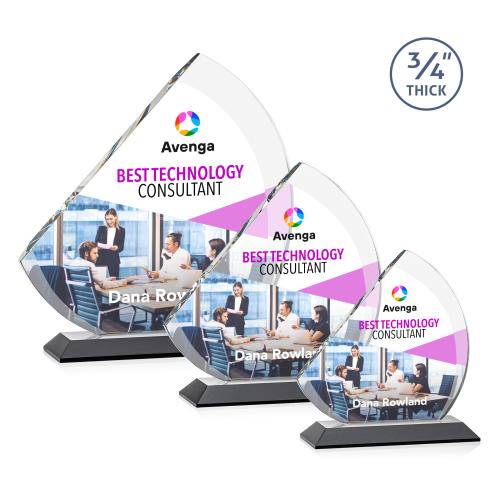 The contemporary Nantucket VividPrint Award is made from thick 3/4" Starfire Crystal with contrasting deep bevels that rise to a flat edge. This striking work of recognition is mounted on an ebony crystal base and is a magnificent award to honor a top performer.