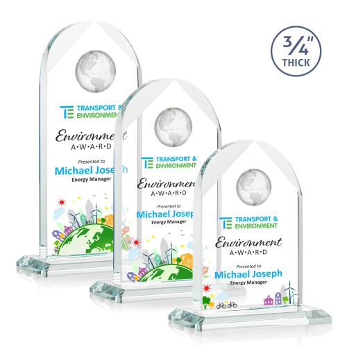 The Starfire Crystal Globe Award features an elegant beveled arched top, optical globe and mounted on a beveled crystal base. Let your message POP with full-color VividPrint!