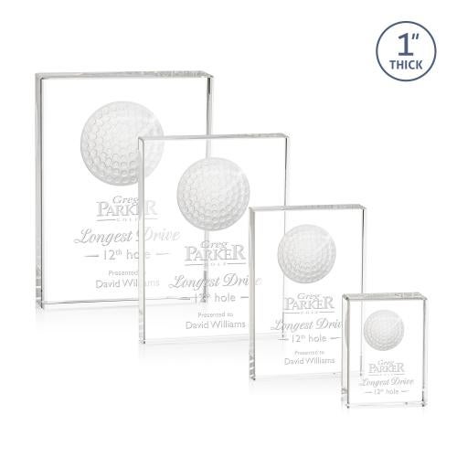 Celebrate a hole-in-one achievement with the Pennington Golf Rectangle Crystal Award, a symbol of distinction in the game of golf. This elegant trophy beautifully combines clear optical crystal with the classic allure of the sport. The intricate 3D golf ball design appears to float within the heart of the award, creating a sense of depth and motion that captures the spirit of a well-played game. Ideal for personalization, this award offers a generous etching area to engrave names, dates, or a heartfelt message, ensuring each recipient feels truly honored. Available in four sizes, it's perfect for tournaments, corporate sponsors, or as a treasured keepsake for golf enthusiasts.