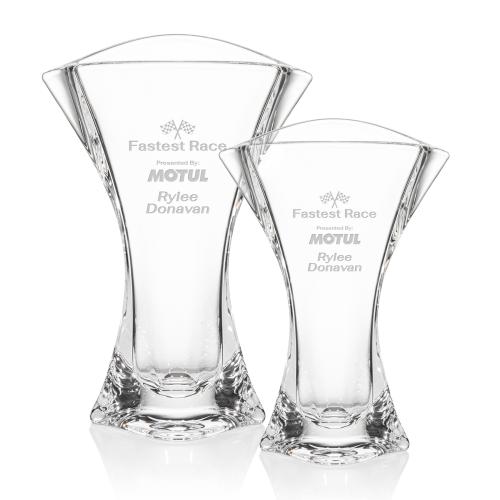 Striking Lead Free Crystalline Vase features a scalloped top that narrows and flares out into a heavy sham base for a magnificent work of achievement recognition or an exquisite token of appreciation. 2nd position etch optional.