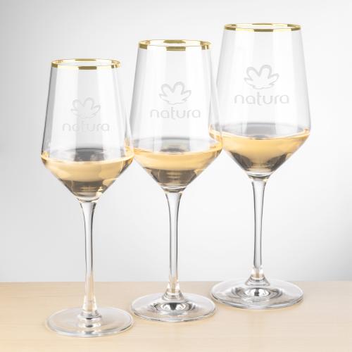 The Tucson Gold Rim Wine Glass features a sleek, contemporary silhouette accented with a refined gold rim for a touch of modern elegance. Its crystal-clear bowl beautifully showcases any varietal while offering ample space for aromas to develop. Perfect for corporate gifts, special events, or upscale recognition programs, this glass adds sophistication to every celebration.