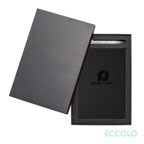 Make a statement. Make waves. The subtle yet modern colored stitching in this bold new journal collection sets it apart. Add your logo to the cover and set your brand apart too. The New Wave Journal & Clicker Pen Gift Set Features... - P197 Clicker Pen: Aluminum click-action ballpoint pen with chrome trim and medium German made refill. - Black die-cut foam Gift Box - Textured FlexiCover - Black covers with wave stitching on spine (color matched) - 192 white pages - Acid-free, 80 gram paper - Undated calendar pages in back (12-month spreads) - Cool gray endpages - Lay flat binding - Color edged pages (color matched) - Bookmark ribbon (black). [*Belly Band & Promo Page Inserts Optional](https://stregisgrp.com/promo/journal-options). See Decorating Info for details.