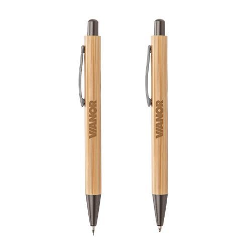 Lucky Clicker Bamboo Pen & Pencil Set features all-natural eco-friendly bamboo barrels and sleek gunmetal accents. Packaged in a wood grain finished recycled craft paper box.