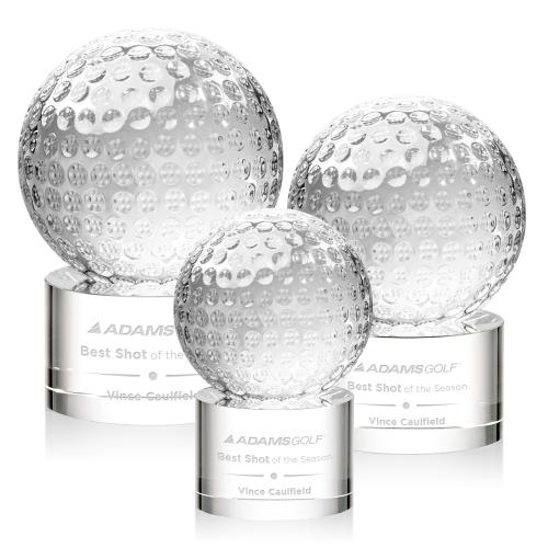 Our exquisite Optical Crystal Golf Ball Award is a timeless tribute to the passion and skill of golfers. The centerpiece of this masterpiece is a flawlessly crafted Optical Crystal Golf Ball that captures and refracts light in a mesmerizing display. Mounted on a complimenting Optical base for personalization with a Logo or Name. This stunning piece of artistry embodies precision and elegance, making it the perfect award or keepsake for golf enthusiasts, tournaments, or special occasions.